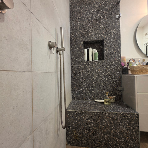 אז במקום "לעבוד עם מה שיש", החלפנו את הייעוד של החדרים. החדר הגדול הפך לחדר השינה שלהם, ויצרנו להם חדר רחצה צמוד גדול ונגיש - עם מקלחת רחבה, מרחב נוח, ומקום למאחזים במקרה הצורך.